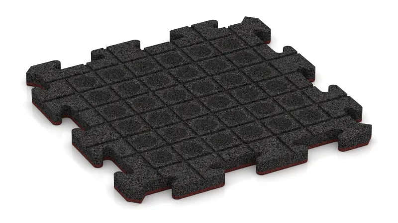 Die Platten bestehen aus PU-gebundenem Gummigranulat. Die elastische, rutschhemmende Oberfläche ist robust und dauerhaft belastbar. Erhältlich in 3 oder 4 cm Stärke, bieten die Puzzlematten zuverlässige Stoßdämpfung bei geringer Aufbauhöhe. Die seitliche Puzzle-Verzahnung sorgt für eine passgenaue Verbindung, eine leichte Fase an den Kanten für ein ruhiges Fugenbild.
