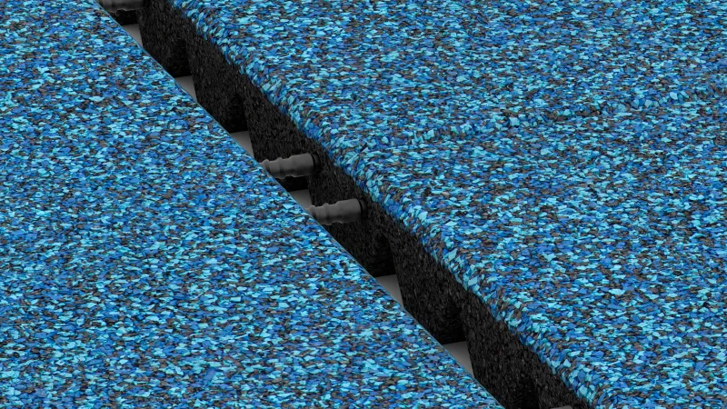 Für den Außenbereich empfiehlt WARCO eine dauerhaft stabile, wasserdurchlässige Tragschicht. Bewährt haben sich Kunststoff-Wabengitter (Kiesgitter) oder ein vorhandener, gebundener und dränfähiger Unterbau wie etwa Drainbeton. Ist die Tragschicht nicht wasserdurchlässig, muss bei witterungsexponierten Flächen ein Gefälle von mindestens 1,5 % zur Entwässerung eingeplant werden. Eine Verlegung auf Schüttgütern wie Sand, Splitt oder Kies ist nicht zu empfehlen – sie verlagern sich unter elastischen Platten und führen zu Instabilität.