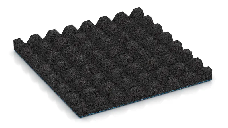 Die Platten bestehen aus PU-gebundenem Gummigranulat mit trittelastischer, griffiger Oberfläche. Dicke und Rohdichte bestimmen das Dämpfungsverhalten und damit die Fallhöhe nach EN 1177. Durch das 50 × 50 cm Raster bleiben Zuschnitte minimal, und Einzelplatten können bei Bedarf schnell getauscht werden.