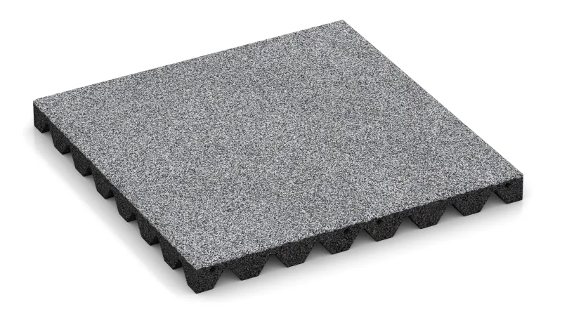Die Platten bestehen aus PU-gebundenem Gummigranulat mit trittelastischer, griffiger Oberfläche. Dicke und Rohdichte bestimmen das Dämpfungsverhalten und damit die Fallhöhe nach EN 1177. Durch das 50 × 50 cm Raster bleiben Zuschnitte minimal, und Einzelplatten können bei Bedarf schnell getauscht werden.