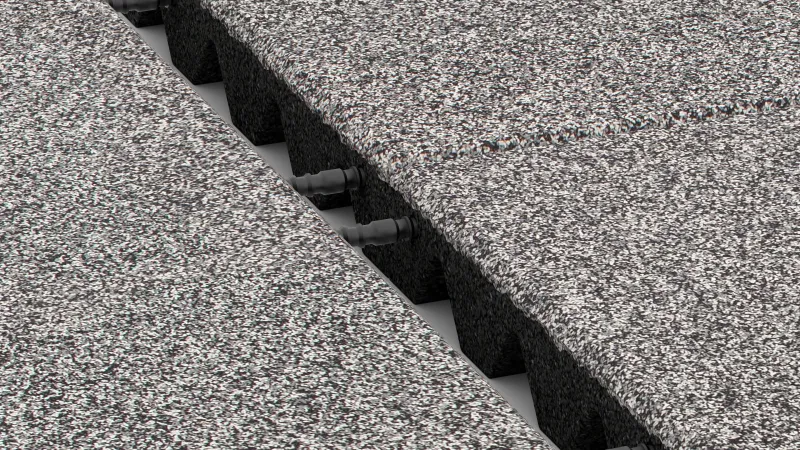 Für den Außenbereich empfiehlt WARCO eine dauerhaft stabile, wasserdurchlässige Tragschicht. Bewährt haben sich Kunststoff-Wabengitter (Kiesgitter) oder ein vorhandener, gebundener und dränfähiger Unterbau wie etwa Drainbeton. Ist die Tragschicht nicht wasserdurchlässig, muss bei witterungsexponierten Flächen ein Gefälle von mindestens 1,5 % zur Entwässerung eingeplant werden. Eine Verlegung auf Schüttgütern wie Sand, Splitt oder Kies ist nicht zu empfehlen – sie verlagern sich unter elastischen Platten und führen zu Instabilität.