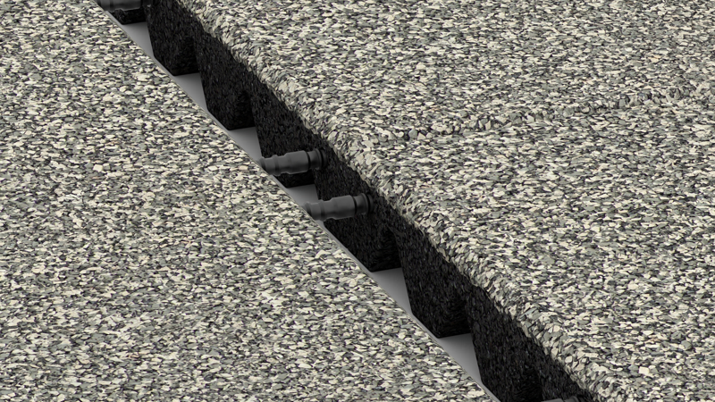 Für den Außenbereich empfiehlt WARCO eine dauerhaft stabile, wasserdurchlässige Tragschicht. Bewährt haben sich Kunststoff-Wabengitter (Kiesgitter) oder ein vorhandener, gebundener und dränfähiger Unterbau wie etwa Drainbeton. Ist die Tragschicht nicht wasserdurchlässig, muss bei witterungsexponierten Flächen ein Gefälle von mindestens 1,5 % zur Entwässerung eingeplant werden. Eine Verlegung auf Schüttgütern wie Sand, Splitt oder Kies ist nicht zu empfehlen – sie verlagern sich unter elastischen Platten und führen zu Instabilität.