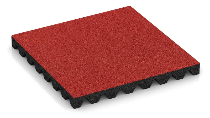 Die Platten bestehen aus PU-gebundenem Gummigranulat mit trittelastischer, griffiger Oberfläche. Dicke und Rohdichte bestimmen das Dämpfungsverhalten und damit die Fallhöhe nach EN 1177. Durch das 50 × 50 cm Raster bleiben Zuschnitte minimal, und Einzelplatten können bei Bedarf schnell getauscht werden.