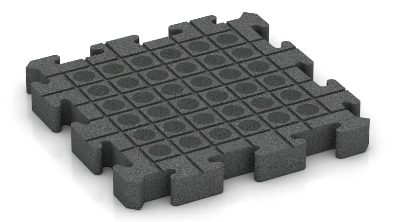 Jede Matte ist mit einer präzise geformten Puzzleverzahnung ausgestattet, die sich leicht und passgenau verbinden lässt. Die umlaufende Fase sorgt dabei für ein sauberes, geordnetes Fugenbild und verleiht der Fläche eine hochwertige Optik. So entsteht ein stabiler, formschlüssiger Plattenteppich.