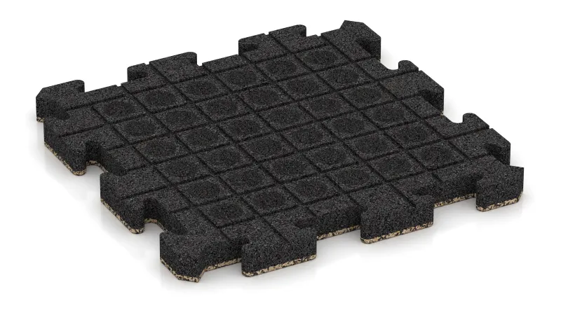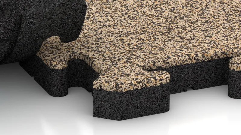 Jede Matte ist mit einer präzise geformten Puzzleverzahnung ausgestattet, die sich leicht und passgenau verbinden lässt. Die umlaufende Fase sorgt dabei für ein sauberes, geordnetes Fugenbild und verleiht der Fläche eine hochwertige Optik. So entsteht ein stabiler, formschlüssiger Plattenteppich.