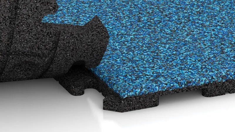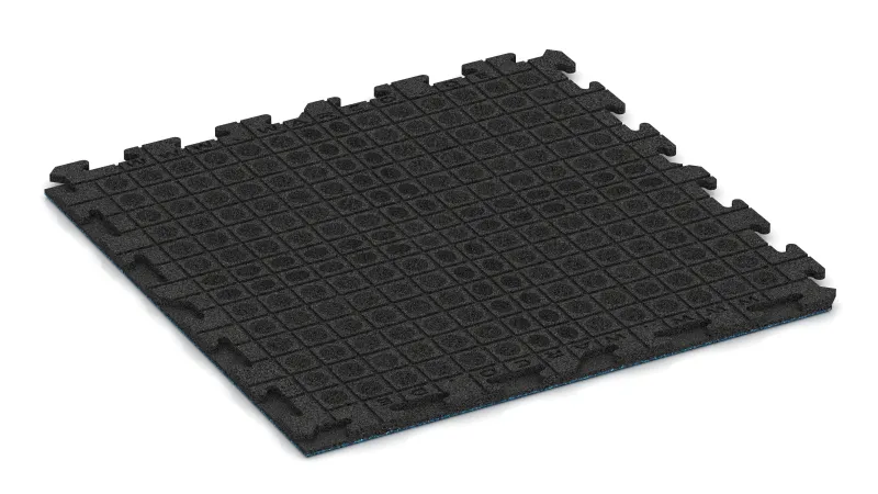 Die Fitnessboden Gummi-Fliesen Classic verfügen über eine verdeckte Puzzleverzahnung. Dabei greifen die Platten wie bei einem Puzzle ineinander, doch die Verzahnung bleibt unter der Oberfläche verborgen. So entsteht beim Verlegen eine stabile und formschlüssige Verbindung, ohne dass die Verzahnung sichtbar ist. Das Ergebnis ist eine geschlossene Fläche mit dem typischen Kreuzfugenbild – einem klaren, ordentlichen Raster, das an ein Schachbrett erinnert und der Fläche eine professionelle Optik gibt.