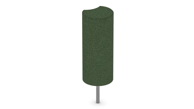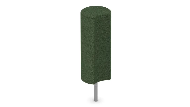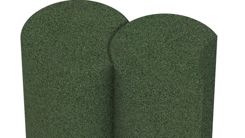 Jede Gummi-Palisade hat einen Durchmesser von 25 cm und ist in den Höhen 40 cm, 60 cm oder 80 cm erhältlich. Der zylindrische Körper besteht aus PU-gebundenem ELT-Gummigranulat (ELT = End-of-Life Tyres) – einem diffusionsoffenen, elastischen und witterungsbeständigen Material. Ein verzinkter Stahlanker ist fest im Inneren der Palisade eingelassen und sorgt für eine stabile Verankerung im Betonfundament. Die seitliche Einbuchtung erleichtert die Montage und Ausrichtung und ermöglicht einen sauberen, bündigen Anschluss weiterer Rundpalisaden.