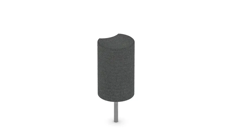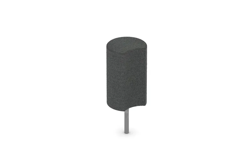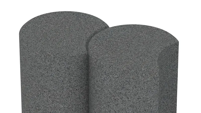 Jede Gummi-Palisade hat einen Durchmesser von 25 cm und ist in den Höhen 40 cm, 60 cm oder 80 cm erhältlich. Der zylindrische Körper besteht aus PU-gebundenem ELT-Gummigranulat (ELT = End-of-Life Tyres) – einem diffusionsoffenen, elastischen und witterungsbeständigen Material. Ein verzinkter Stahlanker ist fest im Inneren der Palisade eingelassen und sorgt für eine stabile Verankerung im Betonfundament. Die seitliche Einbuchtung erleichtert die Montage und Ausrichtung und ermöglicht einen sauberen, bündigen Anschluss weiterer Rundpalisaden.