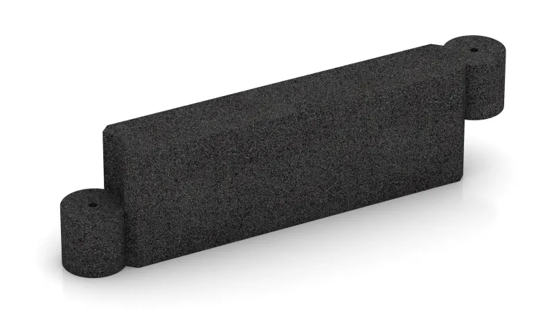 Jedes Kettenelement misst 100 × 30 × 15 cm und besteht aus einem massiven Körper aus PU-gebundenem Gummigranulat. An den Stirnseiten befinden sich zylindrische Enden, die beim Zusammenfügen wie runde Palisaden aufeinanderliegen. Mittig durch diese Enden steckt man ein verzinktes Stahlrohr, das die Kettenelemente sicher miteinander verbindet und bei Bedarf auch im Untergrund verankert.