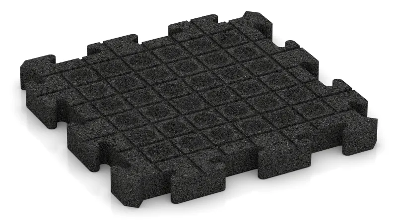 Zwei Plattenseiten verfügen über ein positives Zahnprofil, zwei über ein passendes negatives. Beim Verlegen greifen die Platten von unten formschlüssig ineinander und bilden eine dauerhafte, mechanisch sichere Verbindung. Von oben ergibt sich ein geschlossenes, fugenbündiges Erscheinungsbild mit gleichmäßiger Geometrie, das meist die Form eines klassischen Schachbrettmusters hat.