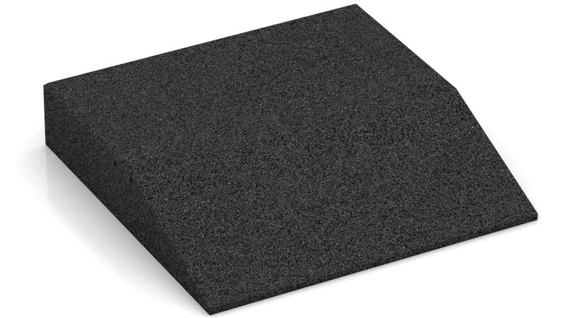 Die Rand-Platte mit einer schräg als Keil ausgeformten Plattenseite ist eine sinnvolle und systemkompatible Ergänzung zur Gummigranulat-Platte Typ FS. Die Rand-Platte wird verwendet, um Stolperkanten zu vermeiden, die am Übergang auf die Gummigranulat-Plattenfläche entstehen, wenn nur ein Teilbereich der Bodenfläche mit Gummigranulat-Platten ausgelegt wird. Durch die Rand-Platte wird also der Niveauunterschied zwischen Bodenfläche und Gummiplatten-Fläche stufenlos ausgeglichen. Unfälle durch Stolpern werden verhindert, ein leichtes Auffahren mit Rollstuhl, Kinderwagen oder Rollator wird ermöglicht.