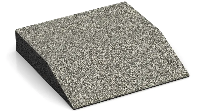 Die Rand-Platte mit einer schräg als Keil ausgeformten Plattenseite ist eine sinnvolle und systemkompatible Ergänzung zur Gummigranulat-Platte Typ FS. Die Rand-Platte wird verwendet, um Stolperkanten zu vermeiden, die am Übergang auf die Gummigranulat-Plattenfläche entstehen, wenn nur ein Teilbereich der Bodenfläche mit Gummigranulat-Platten ausgelegt wird. Durch die Rand-Platte wird also der Niveauunterschied zwischen Bodenfläche und Gummiplatten-Fläche stufenlos ausgeglichen. Unfälle durch Stolpern werden verhindert, ein leichtes Auffahren mit Rollstuhl, Kinderwagen oder Rollator wird ermöglicht.