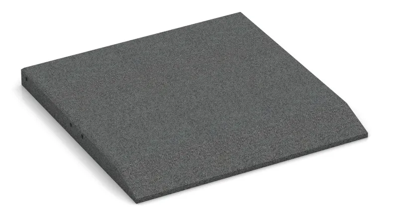 Die Rand-Platte mit einer schräg als Keil ausgeformten Plattenseite ist eine sinnvolle und systemkompatible Ergänzung zur Gummigranulat-Platte Typ FS. Die Rand-Platte wird verwendet, um Stolperkanten zu vermeiden, die am Übergang auf die Gummigranulat-Plattenfläche entstehen, wenn nur ein Teilbereich der Bodenfläche mit Gummigranulat-Platten ausgelegt wird. Durch die Rand-Platte wird also der Niveauunterschied zwischen Bodenfläche und Gummiplatten-Fläche stufenlos ausgeglichen. Unfälle durch Stolpern werden verhindert, ein leichtes Auffahren mit Rollstuhl, Kinderwagen oder Rollator wird ermöglicht.